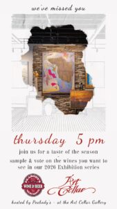Please come to the reopening of the Art Cellar after some lovely renovations and enjoy a pinot noir tasting that will help decide which pinot noir will be served this season at exhibition openings! This will be one of a series over the next couple months featuring different wines. Cabernet Sauvignon is next! There will be a sale sheet available if you find a new favorite as you taste. See you there!